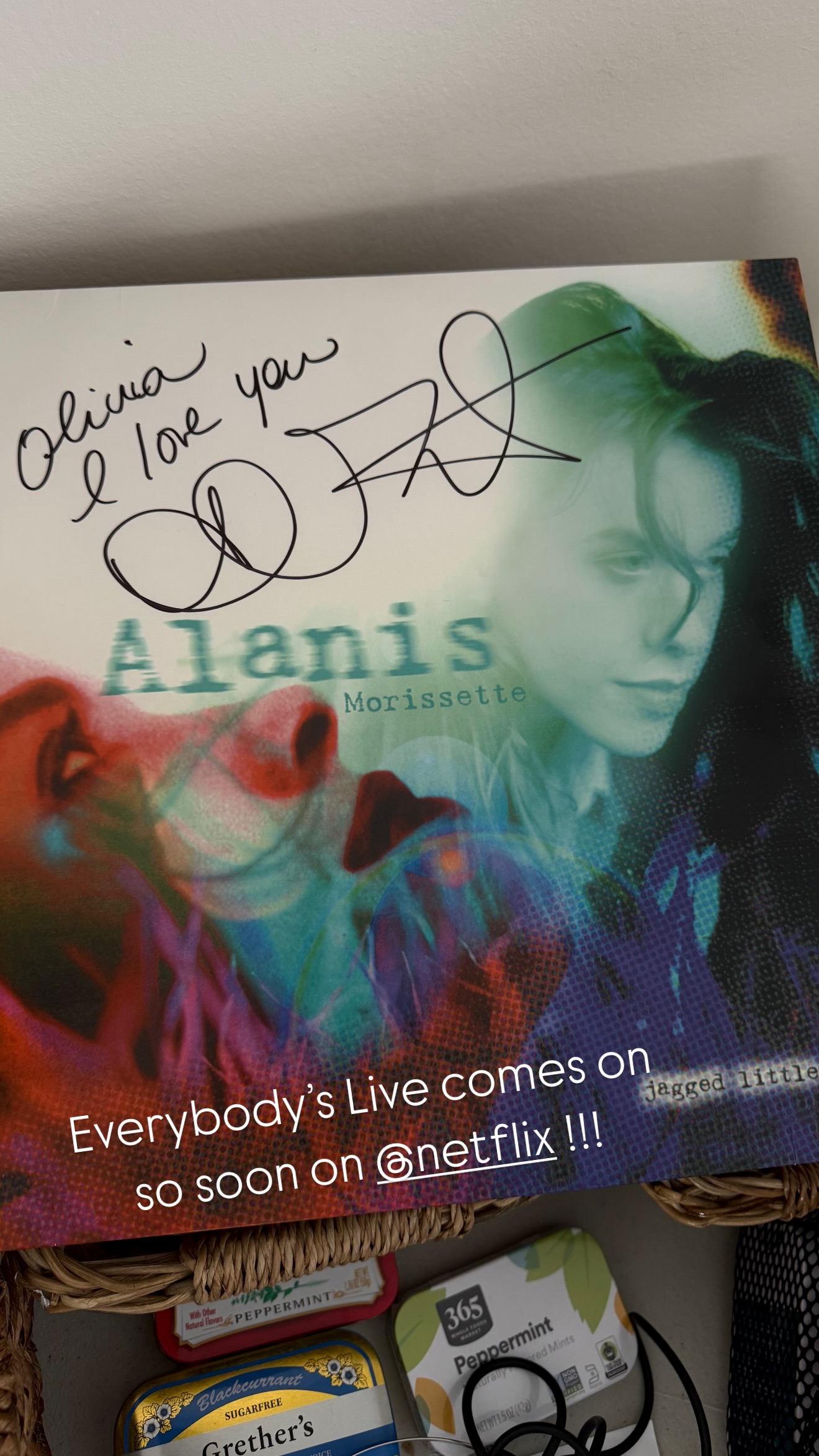 Olivia Munn’s signed copy of Alanis Morrissette’s Jagged Little Pill May 14, 2025.